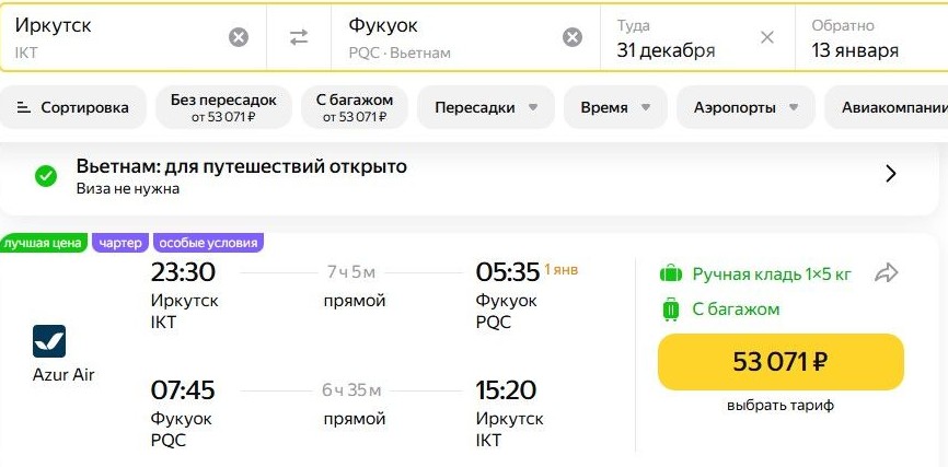 Другое предложение может заинтересовать туристов из Иркутска. AZUR air отвезет чартером на вьетнамский остров Фукуок за 53 тыс. руб. Туда – 31 декабря, обратно – через 2 недели, 13 января.
