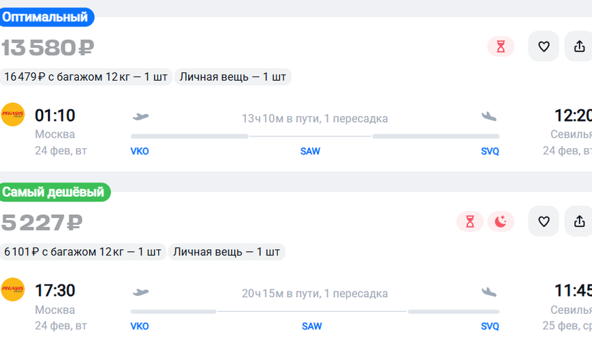 У кого есть дешевые билеты в Европу Туристам с действующим шенгеном можно неплохо сэкономить на перелетах в Европу. Очень приятные ценники обнаружились у Pegasus. Например, 24 февраля всего за 5,2 тыс. налегке можно слетать из Москвы в испанскую Севилью с пересадкой в Стамбуле. С багажом немногим дороже – 6,1 тыс. В данном случае система бронирования предлагает достаточно продолжительную пересадку в аэропорту Сабиха Гекчен в 11 часов. Но в современных реалиях она будет не лишней. Если хочется побыстрее, то есть вариант за 13,5 тыс. Тогда стыковка составит 4,5 часа. Обратные можно тоже поискать – от 9 тыс. без багажа в начале марта. Из Петербурга тоже есть недорогие билеты. Например, 1–9 апреля round trip все в тот же испанский город доступен за 18,6 тыс. На пересадку отводится более 14 часов. Также с берегов Невы можно отправиться в Вену. В марте-апреле есть варианты one way от 10,4 тыс. Тем, кто может себе позволить посетить Германию, которая не очень лояльна в плане выдачи виз россиянам, есть смысл присмотреться к билетам из Пулково в Лейпциг за 7,4 тыс. Здесь придется сделать не самую очевидную пересадку в Анталье. Кстати, один сегмент из Петербурга на турецкий курорт продается в 2 раза дороже. В Берлин можно отправиться за 13,2 тыс., но уже с перелетом через Стамбул.