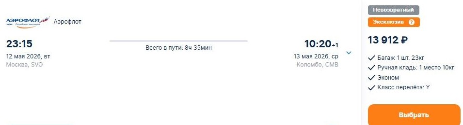 Заметили бюджетные варианты прямых перелетов в Индию и на Шри-Ланку на рейсах «Аэрофлота». Их можно найти на сайте туроператора Библио Глобус и некоторых билетных агентов.