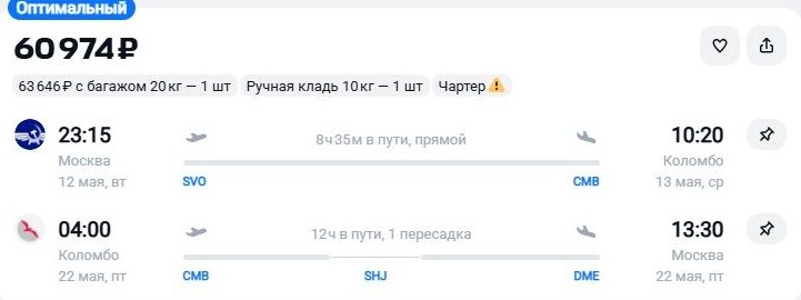 Выгодные тарифы и на финальные рейсы сезонной полетной программы из Москвы в Коломбо. 12 или 15 мая можно слетать на Шри-Ланку за 13,9 тыс. руб., перевозка чемодана входит в цену.