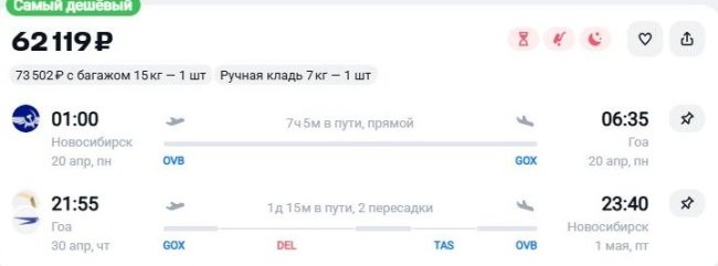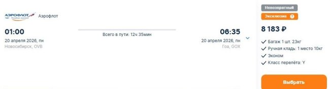Сэкономить получится только на пути в одну сторону. Из Новосибирска в индийский Гоа 20 апреля нацперевозчик доставит за 8,1 тыс. руб., включая багаж (Здесь и далее указаны наличие и цены, актуальные по состоянию на 17:30 14 февраля. – Ред.).