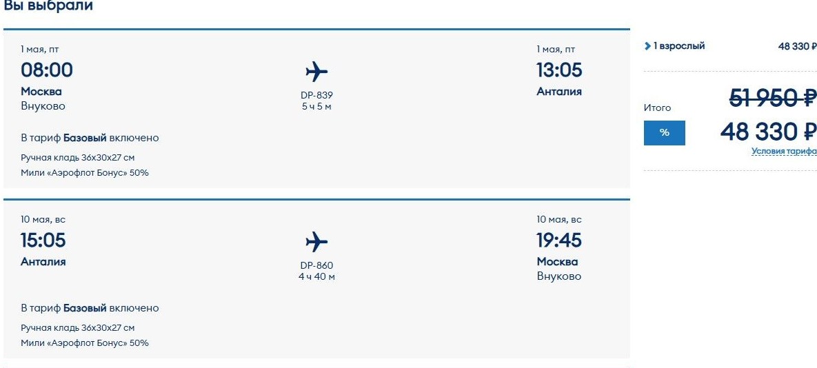 На турецком направлении мы выбрали рейсы из Москвы в Анталью, вылет туда – 1 мая, обратно – 10-го, на этот праздничный период приходится 5 выходных дней. Как выяснилось, билеты «Победы» даже по акции проигрывают предложениям других перевозчиков. Если отправиться в Турцию только с ручной кладью, места на рейсах лоукостера обойдутся в 48,3 тыс. руб. (Здесь и далее указаны наличие и цены, актуальные по состоянию на 18:00 22 февраля. – Ред.).