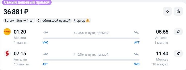 С багажом, по тарифу «Выгодный» придется заплатить 57 тыс. руб. Между тем, комбинацией прямых рейсов Pegasus и Southwind слетать в те же даты в Анталью и обратно можно на 20 тыс. дешевле – за 36,8 тыс. руб., перевозка чемодана включена в стоимость.