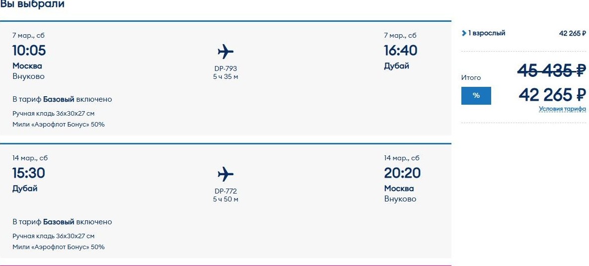 Но сэкономить можно на рейсах в Дубай Commons.wikimedia У лоукостера «Победа» – очередная распродажа. На рейсы из Москвы и Санкт-Петербурга отравлением до 24 октября обещаны по промокоду скидки 5–15% в зависимости от тарифа и даты бронирования (акция действует с 21 по 23 февраля). Мы проверили, доступны ли выгодные варианты по заграничным туристическим направлениям сегодня, во второй день, с дисконтом 7% по безбагажному тарифу «Базовый» и 12% – на «Выгодный» и «Максимум». На турецком направлении мы выбрали рейсы из Москвы в Анталью, вылет туда – 1 мая, обратно – 10-го, на этот праздничный период приходится 5 выходных дней. Как выяснилось, билеты «Победы» даже по акции проигрывают предложениям других перевозчиков. Если отправиться в Турцию только с ручной кладью, места на рейсах лоукостера обойдутся в 48,3 тыс. руб. (Здесь и далее указаны наличие и цены, актуальные по состоянию на 18:00 22 февраля. – Ред.). С багажом, по тарифу «Выгодный» придется заплатить 57 тыс. руб. Между тем, комбинацией прямых рейсов Pegasus и Southwind слетать в те же даты в Анталью и обратно можно на 20 тыс. дешевле – за 36,8 тыс. руб., перевозка чемодана включена в стоимость. А вот на маршруте Москва – Дубай (ОАЭ) выгадать в цене по акции лоукостера вполне реально. Во всяком случае, на даты вылета 7 марта туда, 14-го обратно (их мы выбрали с учетом того, что на этот период в Эмиратах приходится высокий туристический сезон). Билеты «Победы» только с ручной кладью стоят 42,2 тыс. руб. С багажом – 47,6 тыс. При этом, самый бюджетный вариант у «Уральских авиалиний» обойдется в 53,2 тыс., доплата за чемодан – 6 тыс. Места на рейсах S7 Airlines в те же даты еще дороже: 68,5 тыс. руб. плюс 19 тыс. за багаж. Ранее мы писали, какие блюда в обновленном постном меню предложит пассажирам «Аэрофлот».