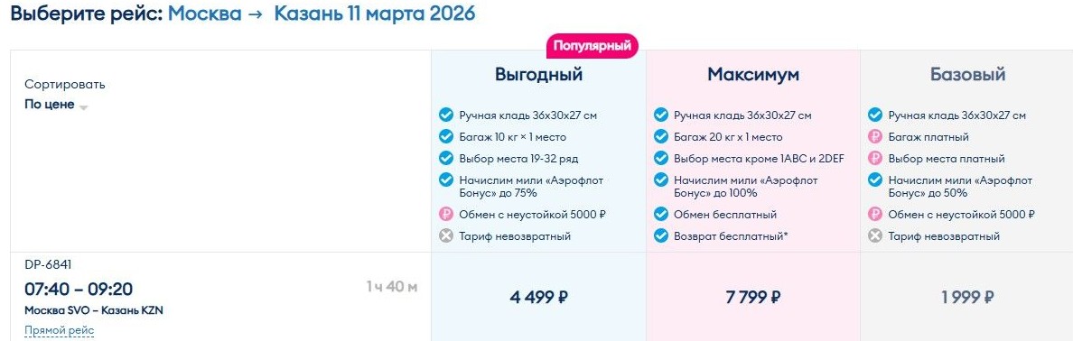 Например, 11 марта можно слетать из Москвы в Казань за 1,9 тыс. руб. – только с ручной кладью, доплата за багажный тариф «выгодный» – 2,5 тыс.