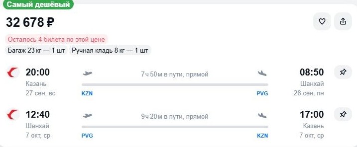 27 сентября перевозчик предлагает отправиться из столицы Татарстана в Шанхай, обратно – 7 октября за 32,6 тыс. руб. Перелет прямой. Наличие и цены мы проверяли 15 марта в 18:30.