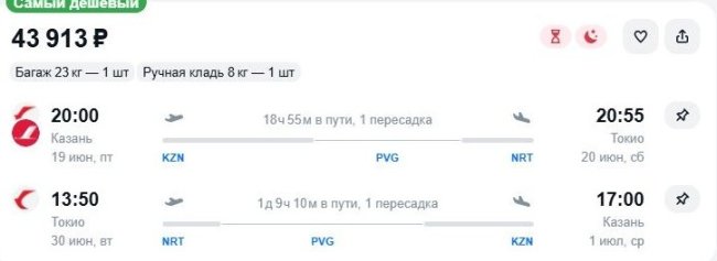 У тех, кого интересует летний отдых, есть возможность отправиться в Японию. China Eastern за 43,9 тыс. руб. доставит в Токио 19 июня, возвращение в Казань – 30-го. Пересадка в шанхайском аэропорту Пудун на пути туда – 7 часов 55 минут, на обратном – длительная, 20,5 часа, есть смысл воспользоваться безвизовым режимом и переночевать в гостинице в китайском мегаполисе.