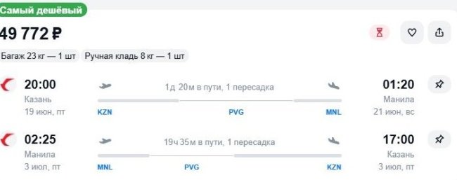 А любителям пляжного отдыха предлагается слетать в первом летнем месяце на Филиппины. Отправление из Казани в Манилу – 19 июня, возвращение – 3 июля. Стыковки в Шанхае – 12 часов 25 минут и 6 часов 45 минут соответственно. Билеты обойдутся в 49,7 тыс. руб., что достаточно бюджетно для столь дальнего маршрута.