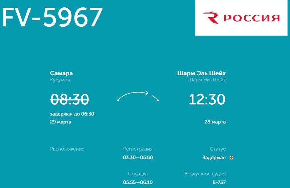 Рейс FV5968 из Шарм-эль-Шейха в Самару должен был отправиться вчера, 27 марта, в 11:55, но отложен на сегодняшний вечер. Прибытие ожидается завтра в 05:20.