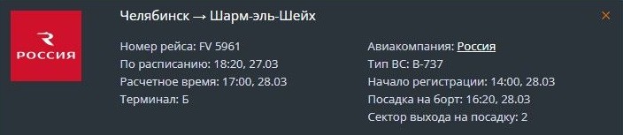 Почти на сутки задерживается и вчерашний рейс FV5961 из Челябинска в Шарм-эль-Шейх. Судя по табло аэропорта, самолет отправится сегодня в 17:00 вместо 18:20 27 марта.