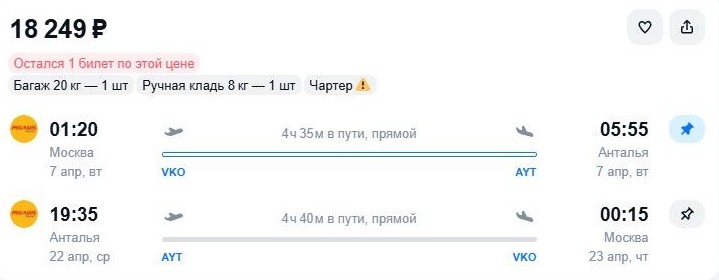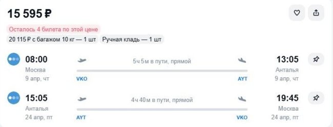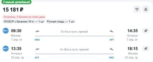На какие даты есть выгодные варианты Freepik В системах онлайн-бронирования замечены относительно недорогие билеты на рейсы «Победы» в Анталью из российской столицы. Так, отправиться на турецкий курорт только с ручной кладью 7 апреля, обратно – через 2 недели, 22-го, предлагается за 15,1 тыс. руб. С багажом – на 4,3 тыс. дороже (здесь и далее указаны наличие и цены, актуальные по состоянию на 18:30 4 апреля. – Ред.). Чуть повыше тариф на перелет с 9 по 24 апреля – 15,5 тыс. руб. либо 20,1 тыс. с учетом перевозки чемодана. Для бронирования по указанным ценам агрегаторы переадресуют на сайты некоторых билетных агентов, туроператоров или туристических сервисов банков. Непосредственно на сайте самого лоукостера тарифы выше – от 20,7 тыс. руб. за перелеты в те же даты налегке и от 26,7 тыс. – с багажом. Добавим, близкий по стоимости вариант перелета по этому маршруту предлагается на чартере авиакомпании Pegasus – 18,2 тыс. руб. Для сравнения: билеты round trip «Аэрофлота» стоят 29,2 тыс. руб., S7 Airlines – 28 тыс. 13 тыс. за багаж. В условиях резкого удорожания авиатоплива в иностранных аэропортах издержки перевозчиков растут. Но, как видим, выгодные предложения перелетов за границу пока все же встречаются.