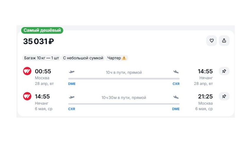Если выбрать путешествие на рейсах Red Wings с вылетом из Домодедово в Нячанг 28 апреля и возвращением из ЮВА в столицу 6 мая, то round trip обойдется всего в 35 тыс. руб. В стоимость уже включен багаж 10 кг, что для короткого пляжного вояжа может быть вполне достаточно.