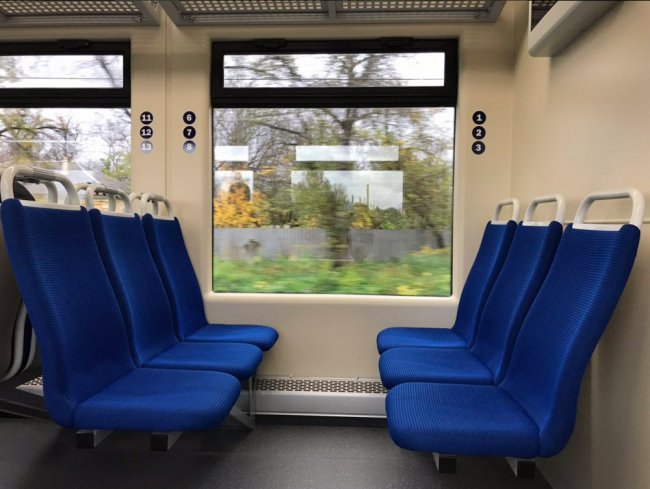 Кресла в салоне рельсового автобуса PESA 620M расположены друг напротив друга по схеме 2+3