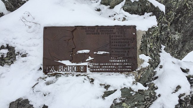 Мемориальная плита в память о погибших туристах из группы Дятлова, закреплённая на останце поблизости от места происшествия