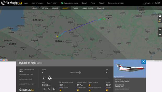 Согласно информации портала, самолет с бортовым номером EW-005DE около 6:30 по местному времени в среду,12 августа, вылетел из белорусской столицы и приземлился в районе подмосковной Кубинки, где расположен военный аэродром. Затем, около 10:46, предположительно, транспортник покинул авиабазу и спустя четыре часа полета приземлился в аэропорту Новосибирска. В обратную сторону самолет выдвинулся спустя три часа после посадки — в 23:00 по местному времени он совершил посадку в аэропорту Минска.