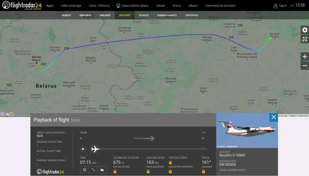 Согласно информации портала, самолет с бортовым номером EW-005DE в пятницу, 14 августа, вылетел из белорусской столицы около 10:14 по местному времени и спустя полтора часа совершил посадку в Рязанской области в районе авиабазы Дягилево. Через три часа после прибытия, в 14:20, транспортник выдвинулся в обратном направлении и около 15:41 вернулся в Минск.