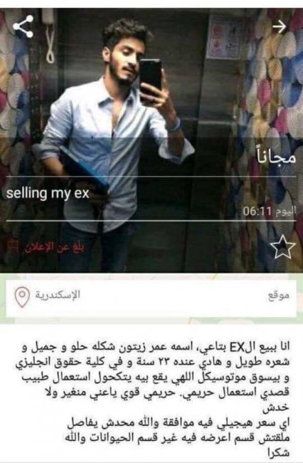 "Продаю экс-бойфренда. Его зовут Омар Зейтун. Красивый, спокойный, с длинными волосами, без царапин. Изучает право и водит мотоцикл", - говорится в объявлении.