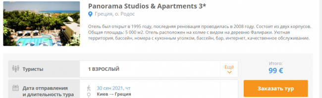 Туристические агентства подсчитали, что отдых в Греции этой осенью будет стоить от €100 с человека. По сравнению с летним сезоном, цены ощутимо снизились. «Eva-Travel.ru», собрав информацию у различных туристических агентств. Сейчас Греция остается одной из самых популярных морских направлений. Погода в стране позволит отдыхать на пляже еще весь сентябрь и октябрь. Обещают, что температура воздуха днем будет колебаться между 21°C и 24°C, а вода останется на уровне 20° везде, кроме холодных регионов. предлагает отдохнуть у них за €133. В цену не входит трансфер и питание. Panorama Sea View Studios