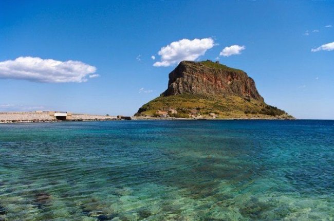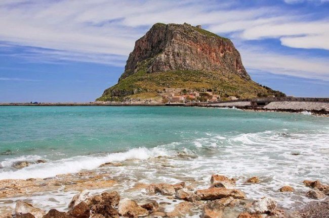 Скала, на которой расположен этот небольшой греческий город, появилась в результате мощного землетрясения, произошедшего здесь в четвертом столетии нашей эры. До ХХ-го века в город можно было попасть только морем. А первый камень здесь был заложен только через два столетия после катаклизма. Город надежно защищен с тыла возвышающимся горным ландшафтом. Весь остров составляет в ширину 300 метров, при длине порядка километра. Город-крепость Монемвасия является живым образцом культурного наследия византийской, османской и венецианской культуры. В течение многих столетий этот город переходил из рук в руки, пока не был возвращен греками обратно в XIX-м столетии во время освободительной войны.
