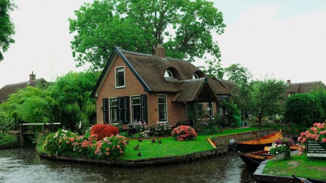 Все дома частные, покрытые характерной соломенной крышей, а вокруг них разбиты цветущие сады. Жить тут, наверное, скучновато, но вот если посетить Гитхорн всего на день-два, покажется, что попал в параллельную реальность, где все живут спокойно и счастливо.