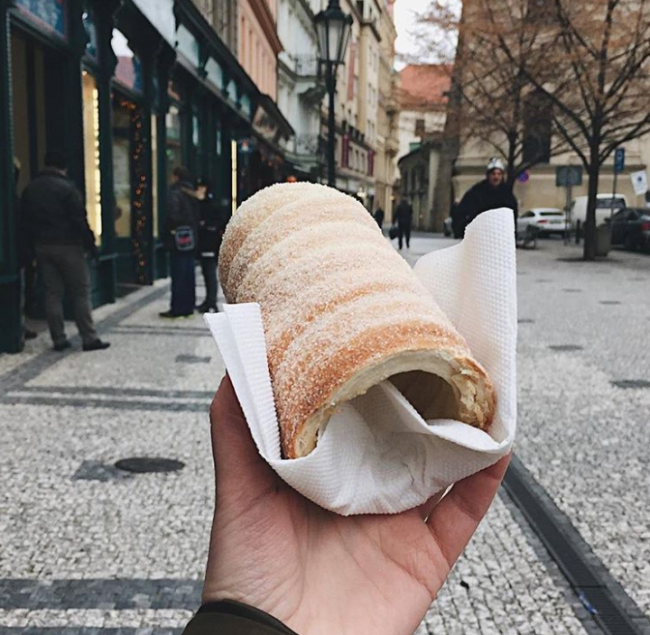 Трдельники — знаменитые пражские булочки из сдобного теста с ароматной посыпкой из корицы, орехов и сахара. Обычно его наполняют кремом, сливками или мороженым.