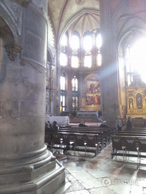 Храм буквально напичкан бесценными произведениями искусства и христианскими реликвиями. Здесь как величайшая святыня хранится платок, которым, по легенде, святая Вероника утерла пот с лица Иисуса, когда его вели на распятие. Считается, что на ткани остались следы крови Христа.