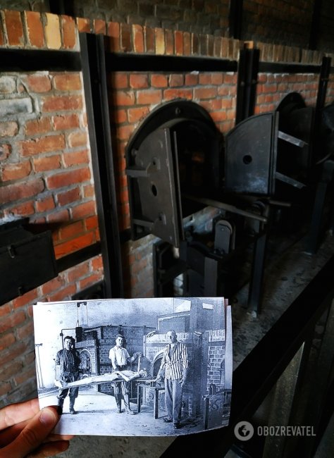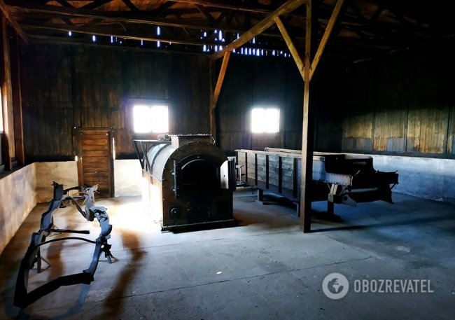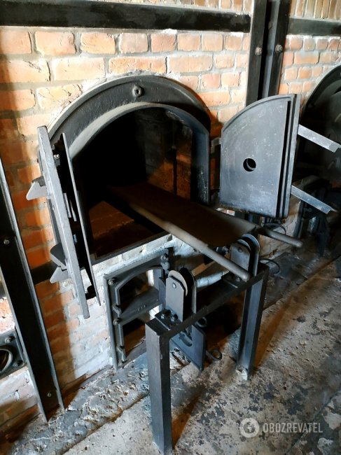 Слева направо: фрагмент грузовика, который перевозил тела мертвых из газовых камер в крематории, печь крематория, кузов грузовика для перевозки трупов