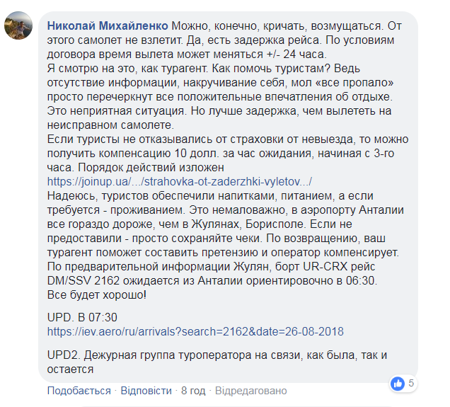 В комментариях потерпевшему советуют писать заявление на компенсацию из-за задержки рейса. Турагент Николай Михайленко утверждает, что по условиям договора, если туристы не отказывались от страховки от невыезда, в подобных случаях можно получить компенсацию 10 долл. за час ожидания. Также во время задержки, по словам мужчины, туристов должны обеспечить напитками, питанием, а если требуется – проживанием. Если всего этого не предоставили - нужно сохранять чеки, а по возвращению, турагент должен помочь составить претензию, а оператор компенсировать ущерб.