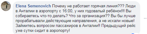 "Почему не работает горячая линия? Люди в Антальи в аэропорту с 16:00, у них годовалый ребенок! Вы собираетесь что-то делать? Что за организация? Вы бы лучше прорабатывали действующие направления, а не искали новые! Займитесь вопросом пассажиров в Антальи! Предыдущий рейс уже сутки сидит в аэропорту!" - пожаловалась Елена Семенович.