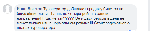 Иван Выстов заявил, что туроператор добавляет продажу билетов на ближайшие даты, в день по четыре рейса в одном направлении. "Как же так? Он и двух рейсов в день не может выполнить в нормальном режиме! Стоит задуматься о планах туроператора", - добавил он.